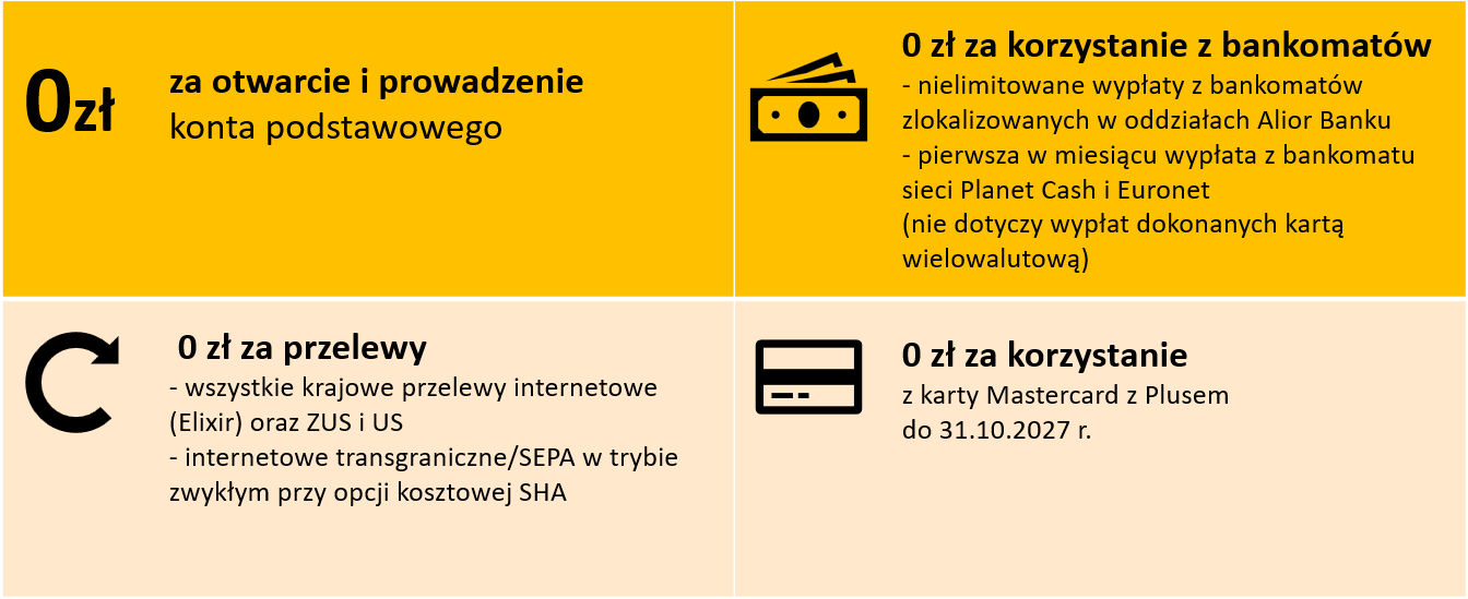 Promocja „Karta z Plusem za 0 zł” obejmie klientów, którzy do 12 miesięcy przed okresem przystąpienia do tej promocji nie posiadali w Alior Banku żadnej debetowej karty firmowej i którzy w okresie od 20.10.2025 r. do 30.09.2026 r. zamówią kartę Mastercard z Plusem do rachunku iKonto Biznes, 4×4 lub Plan Biznes. Zwolnimy Cię z opłat miesięcznych za korzystanie z tej karty od dnia przystąpienia do promocji do 31.10.2027 r. Po tym okresie pobierzemy opłatę zgodnie z obowiązującą dla tej karty taryfą opłat i prowizji.
