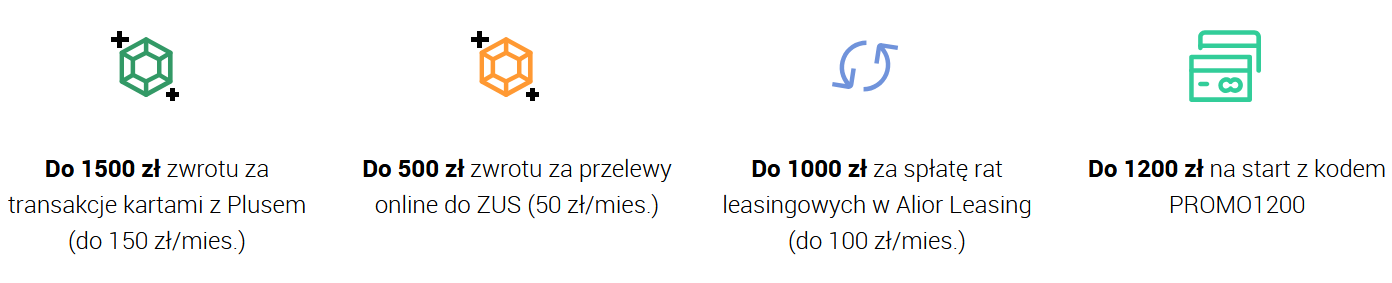 W promocji Moneyback mogą wziąć udział klienci, którzy od 20.10.2025 r. do 30.09.2026 r. zawrą umowę o rachunek firmowy (iKonto Biznes, rachunek 4x4 lub Plan Biznes) z kartą debetową Mastercard z Plusem i od 1.01.2025 r. do 19.10.2025 r. nie posiadali w Alior Banku rachunku firmowego i firmowej karty debetowej. Klient może otrzymać premię moneyback w wysokości 5% kwot transakcji gotówkowych i bezgotówkowych wykonanych firmowymi kartami debetowymi Mastercard z Plusem, nie więcej niż 150 zł miesięcznie (do 1500 zł w ciągu 10 miesięcy korzystania z promocji) oraz premię 50 zł za wykonany przelew online do ZUS (nie więcej niż 500 zł w ciągu 10 miesięcy korzystania z promocji). Wypłacimy premię moneyback za dany miesiąc, jeśli w tym miesiącu klient wykona minimum jeden przelew online do ZUS z rachunku firmowego oraz wykona kartami z Plusem min. 3 transakcje (gotówkowe lub bezgotówkowe) oraz utrzyma łączne saldo na rachunkach firmowych min. 1500 zł. Jeśli klient spełni warunki otrzymania premii moneyback i z rachunku firmowego dokona spłaty raty leasingowej wynikającej z umowy z Alior Leasing Sp. z o.o. w kwocie min. 1000 zł, to otrzyma dodatkową premię w wysokości 5% raty leasingowej – nie więcej niż 100 zł miesięcznie (do 1000 zł w ciągu 10 miesięcy korzystania z promocji). Szczegółowe zasady promocji Moneyback i „Karta z Plusem za 0 zł” opisuje regulamin promocji „Plusy Karty z Plusem” dla posiadaczy firmowej karty debetowej Mastercard z Plusem Alior Banku SA – edycja V.